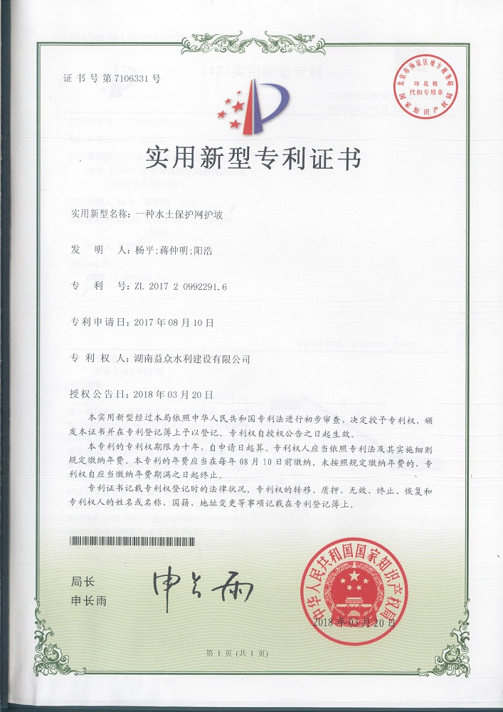本實用新型公開了一種水土保護(hù)網(wǎng)護(hù)坡,包括一級園路、二級園路和設(shè)于一級園路、二級園路之間的斜護(hù)坡,所述斜護(hù)坡的底層為原漿砌塊石護(hù)坡且原漿砌塊石護(hù)坡嵌入設(shè)有六方塊,所述原漿砌塊石護(hù)坡的上部依次鋪設(shè)有厚種植土層、水土保護(hù)網(wǎng)、薄種植土層和草坪,所述水土保護(hù)網(wǎng)與厚種植土、薄種植土層之間通過在水土保護(hù)網(wǎng)上穿設(shè)有若干個鋼釘固定相連,所述一級園路澆筑時預(yù)留有長鋼筋以實現(xiàn)長鋼筋與水土保護(hù)網(wǎng)綁扎牢固,所述二級園路澆筑時也預(yù)留有長鋼筋以實現(xiàn)長鋼筋與水土保護(hù)網(wǎng)綁扎牢固。本實用新型提供的一種水土保護(hù)網(wǎng)護(hù)坡,既能夠防止流水沖刷,又滿足景觀要求。
