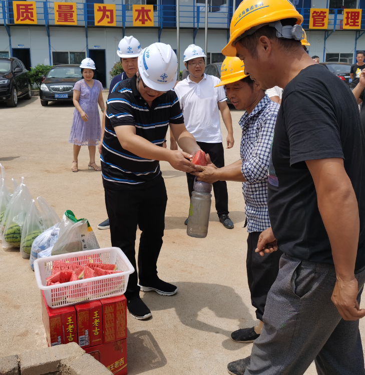 張?chǎng)卧谖繂柆F(xiàn)場(chǎng)親手為施工一線工友送上了已切好的西瓜,并將備好的慰問品一件件地送到職工和工友手里。對(duì)基層員工和一線工人不辭辛苦戰(zhàn)高溫、斗酷暑的工匠精神表示贊揚(yáng)。