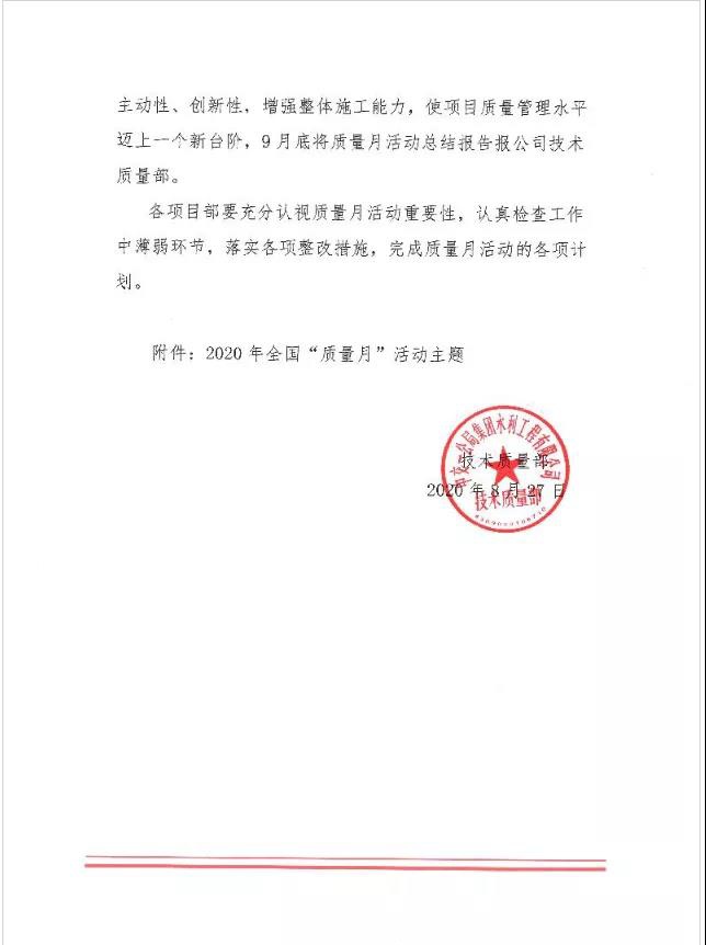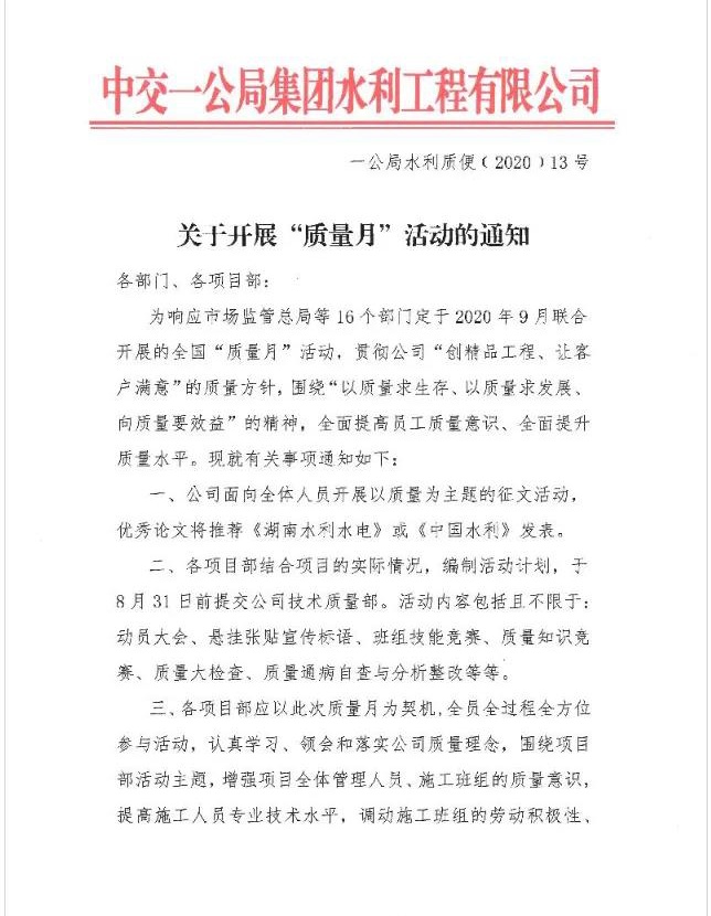 2020年9月是全國(guó)第43個(gè)質(zhì)量月,為響應(yīng)國(guó)家質(zhì)量月活動(dòng),貫徹公司“創(chuàng)精品工程、讓客戶滿意”的質(zhì)量方針,提升公司及各項(xiàng)目部質(zhì)量管理水平,水利公司下發(fā)了《關(guān)于開(kāi)展“質(zhì)量月”活動(dòng)的通知》,要求公司各項(xiàng)目部認(rèn)真開(kāi)展質(zhì)量月活動(dòng)。