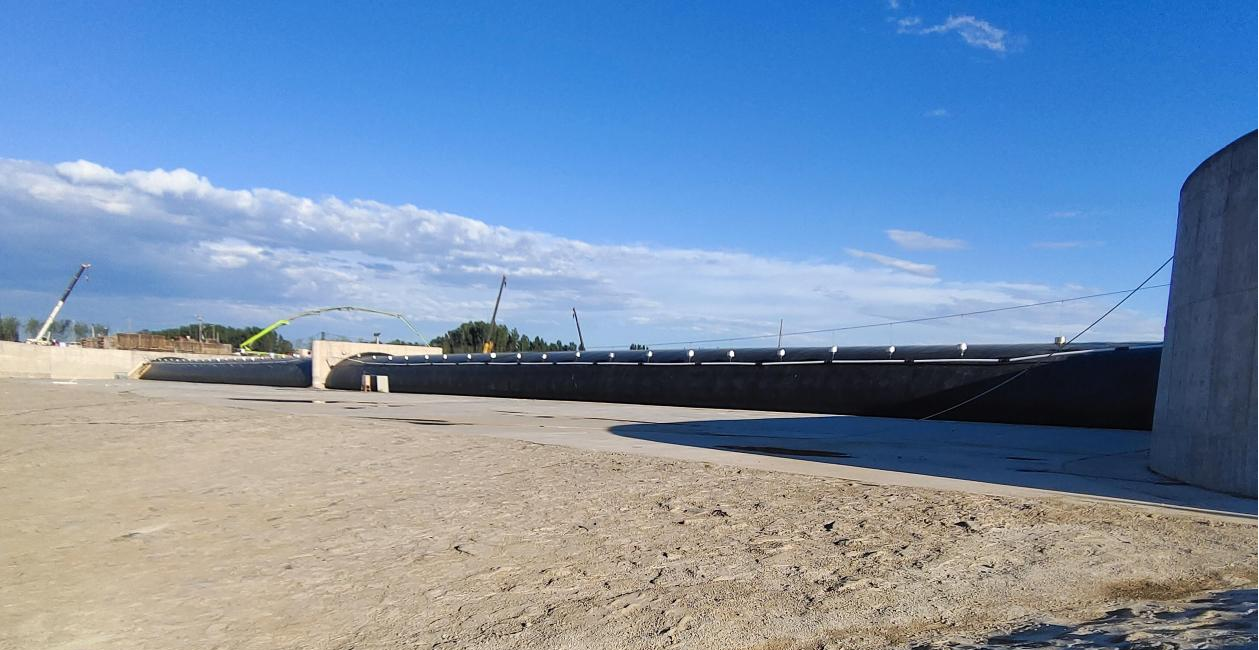 本項目于今年年初開工,工程工期緊任務(wù)重。為保證項目如期完工,項目部頂住疫情及春節(jié)假期壓力,在保證安全和質(zhì)量的前提下,采用輪班制,換人不換機(jī),24小時晝夜施工,于5月20日順利完成主體工程橡膠壩壩底、消力池、鋪蓋段、海漫及塊石防沖槽等部分。隨后,項目開始進(jìn)行壩袋充水實驗,經(jīng)過36個小時的連續(xù)觀察,壩袋無滲水漏水現(xiàn)象,充水試驗順利完成。本次試驗成功,標(biāo)志著橡膠壩施工質(zhì)量已達(dá)到設(shè)計和技術(shù)標(biāo)準(zhǔn)要求,對于工程徹底完工及投入使用具有重要推動作用。