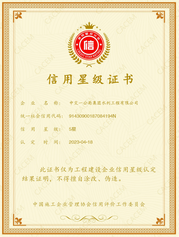 近日,在中國施工企業(yè)管理協(xié)會信用評價工作委員會組織開展的2023年工程建設(shè)企業(yè)信用星級認定工作中,公司被協(xié)會認定為五星級企業(yè)。